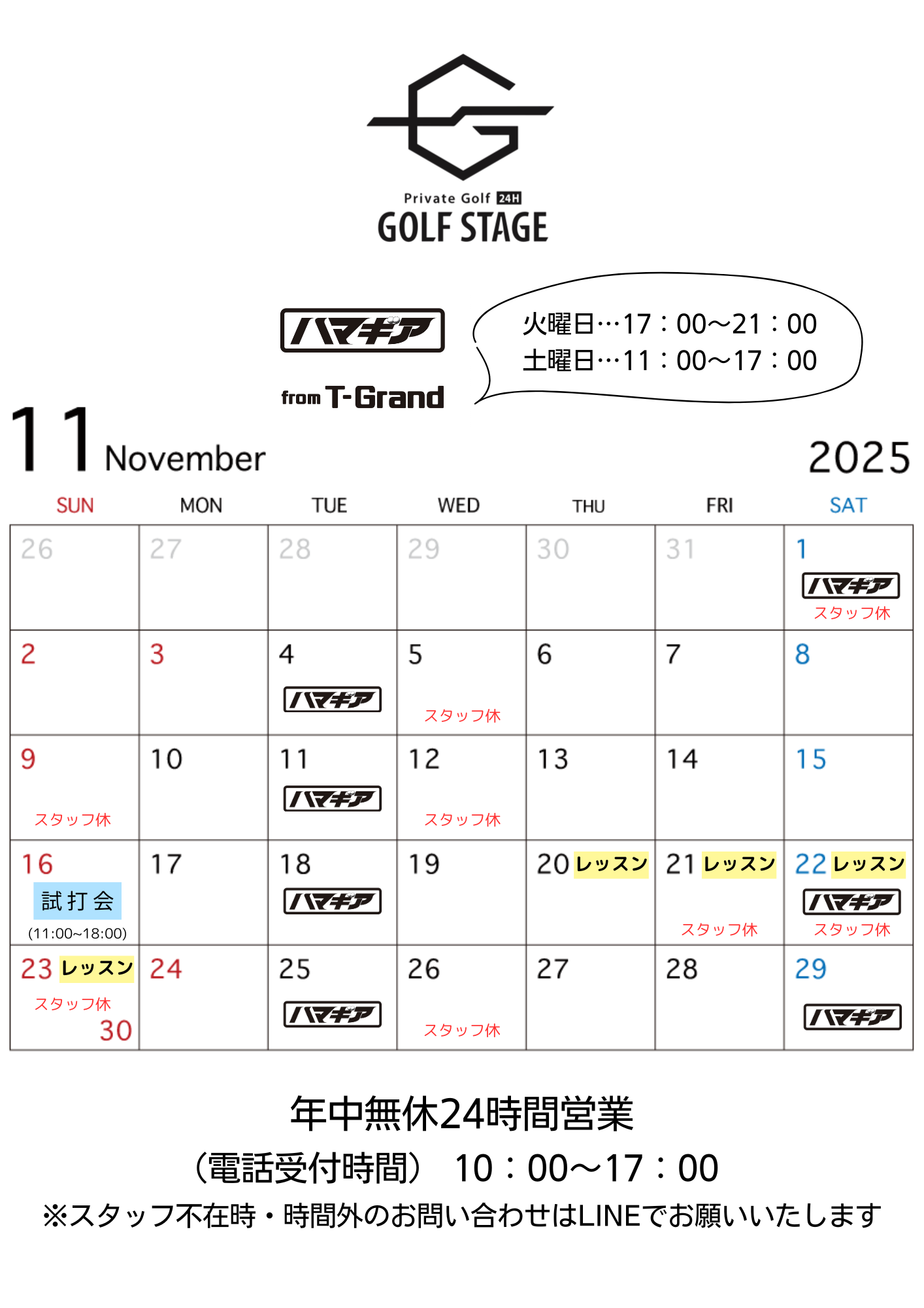【ゴルフ工房ハマギア】(火曜)17:00~21:00 (土曜)11:00~17:00
